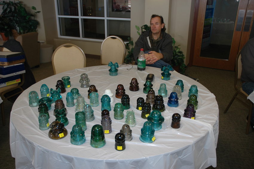 Here's Dennis at his table. That mine insulator, half hiding behind that dark amber signal, and just in front of the empty left hand chair, went home with me. I guess that means it really IS mine! Heh heh.