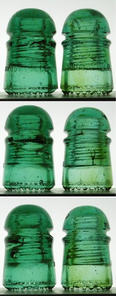Up for sale is a pair of great character Brookfield CD 102s. On the left is a [030] with large bubbles protruding outwards from the threads. Unfortunately they're dominantly in the rear skirt. A small amount of amber-swirling is present, giving the piece a sort of green aqua cast overall. Two partially nicked drips, a 1/8" left side front skirt fleabite, another on the front left crown, and a 1/4" open bubble in the left front wire groove, seemingly scraped open by the line wire. On the right is another [030], with at least part of every letter in "BROOKFIELD" ghosted over top of the main embossing. As well, it has a nice bit of amber swirling throughout as fine wisps, that give the piece an almost two-tone colouration. Some swirling is visible here and there throughout the crown. 7 partially nicked drips, and a 1/4" rear crown flake, probably from a potstone inclusion next to it. Asking $8.00 apiece or $14.00 US plus shipping for the pair. I accept PayPal, or personal cheque from any member of ICON or any collector with whom I have dealt before. Please feel free to contact me with any questions or for more photos, and look through my other items or unsold sales stock to combine shipping on items. |