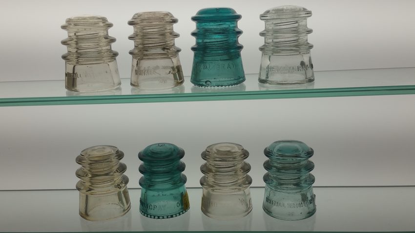 Here is an instant mini collection of 8 CD 115.... Top Row Whitall EIN 070 Off Clear Whitall EIN 070 Pink Tint Hemi (SPD) EIN 020 Blue Aqua Hemi EIN 100 Clear (tough) Bottom Row Whitall EIN 050 Straw Hemi (RDP) EIN 050 Aqua Whitall EIN 070 Clear Whitall EIN 040 Light Aqua All are in great shape. the Hemi w/sdp has 4 or 5 chips\ped drips Whitall in straw has a small fracture on lip of wire groove but not glass missing How about $30.00 shipped to your door (USA only). Check or Money Order only No the shelf is not leaning...must of been the person operating the camera |