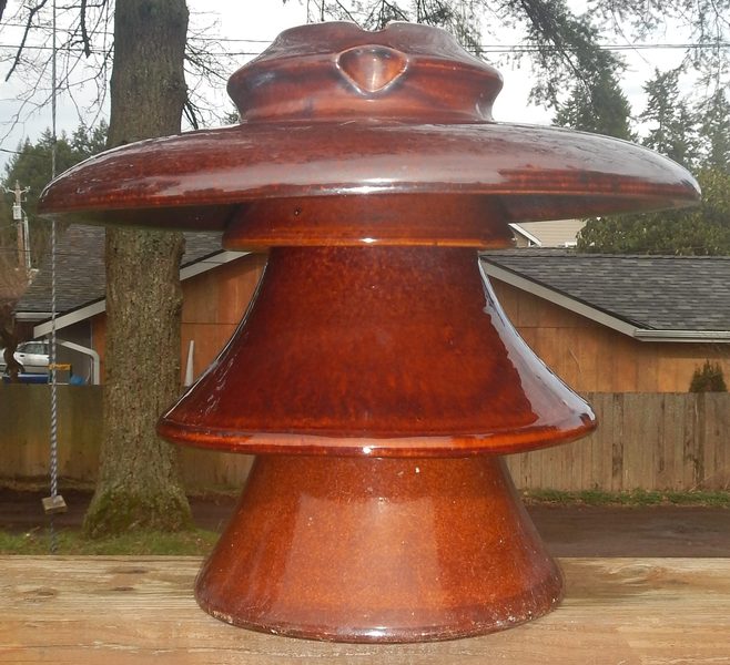 Introducing the M-4325b ! This triple lilyshell stile was used as a replacement insulator in the 1909-1912 era on a line from the Bear River Powerhouse to Ogden Utah . The line built in 1903 used the M-3236 Fred Locke which appears to have had a fairly high failure rate in service so they were replaced with this better made larger and slightly newer four part design whenever a change out was preformed . It is possible these may have also seen service some place else in Utah but none have ever been found to date . It took me a long time to find enough good unbroken skirts to put this one one together but I finally did it . This stile was #353 and was listed in the 1910 and 1913 Locke catalogs |