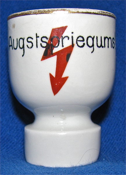 Here's a miniature insulator shaped schnapps cup I've never seen before with an unknown Latvian insulator manufacturing mark on it stamped on crown in blue ink and appears to read: "18 (fish logo) 12; MMSK" [id=460530829]. Also says "Augstspriegums!" (which is Latvian for High Voltage!) with a red lightning bolt. There is wear on the gold leaf around the rim but none applied inside the cup. This unique and rare example of mini Latvian insulator shaped schnapps cup with no chips or cracks with light rim and some surface wear is available to the first email for only $175 postpaid. Thanks! |