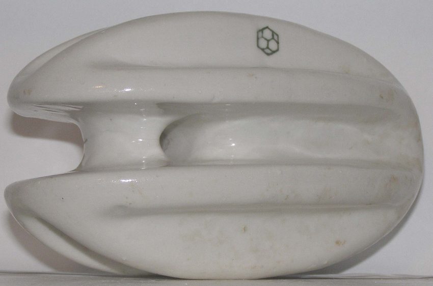Here is a larger white porcelain strain from Hungary with an inkstamped logo. Strain is in good condition with just a small flake and some rubbing from the wire. Measures 5 1/2" X 3 1/8" -- $12 plus actual postage additional (should fit in a regional A box). Thanks to Caleb for additional information -- the logo on this strain indicates it is made by AEG of Germany! |