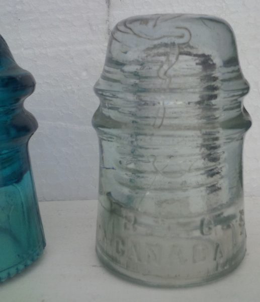 I have available a Canadian toll. The embossing is B.T.Co. Over a blot out. All above CANADA over a blot out of MONTREAL. This is in a prism embossing. The colour is a silky off clear. Pictured beside a Hemingray 9. There is a squiggly crease starting on the front dome working it's way towards the w/g. There is some small bubbles in the glass. The only damage is a minimal 1/2" base flake on the rear. I'm asking US $20. Plus shipping. PayPal cheque or MO now $12. Thanks. Graham. |