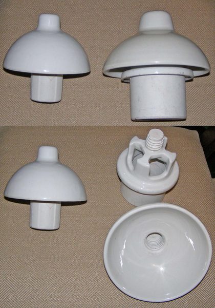 Here are two more early service entry insulators! These are made in two parts that connect together to provide protection to wires entering a house or business. Actual postage additional. Here is how they were used [330748602] 5" diameter two part insulator, unmarked and in good condition -- $15 6" diameter two part insulator, unmarked and in good condition -- $20 Or take the pair for $30 |