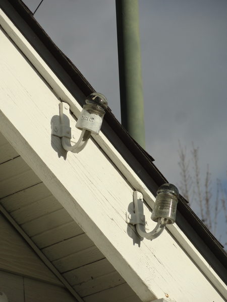 A little closer view, as found. A sight not that uncommon around here 50 years ago, glass pintypes on J-hook pins used as strikes for a subscriber drop. And it wasn't unusual to see C.G.I.Co. ponies in use around here either. What is unusual is seeing these insulators used in a house strike application, and more unusual still, is that they were still there waiting to be found in 2016. Two identical, near colorless PT variant C.G.I.Co.'s left in place when the wires were taken down. The 94-year-old owner of the house said the house was built in 1915, coinciding perfectly with when these insulators were made. The pins are a Pierce or Hubbard "spring" type J-hook. |