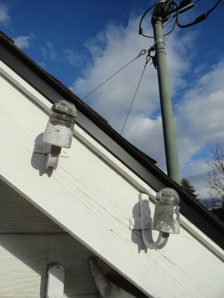 Closer still, I spun the lower piece around so both embossings could be seen. A sight not that uncommon around here 50 years ago, glass pintypes on J-hook pins used as strikes for a subscriber drop. And it wasn't unusual to see C.G.I.Co. ponies in use around here either. What is unusual is seeing these insulators used in a house strike application, and more unusual still, is that they were still there waiting to be found in 2016. Two identical, near colorless PT variant C.G.I.Co.'s left in place when the wires were taken down. The 94-year-old owner of the house said the house was built in 1915, coinciding perfectly with when these insulators were made. The pins are a Pierce or Hubbard "spring" type J-hook. |