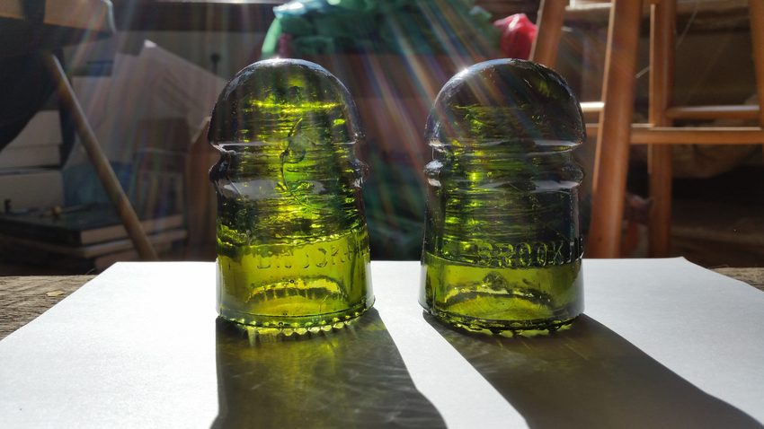 Here is a picture of them in the sun. There are amber steaks throughout but they are hard to see. The main problem is that the one has damage to almost all the drip points, and the other one has a couple of chips on the base and a chip on the upper wire guide rim. |