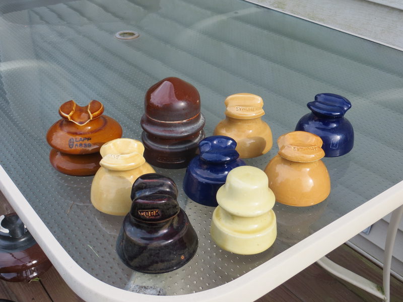 Here is a group of insulators I am looking to sell. The are from front to back, left to right: gray and maroon mottled Cook U-472, VNM, $2 yellow unmarked U-291, VNM, $4 light yellow Thomas U-629B, VNM, $5 butterscotch Thomas U-629B, VNM, $6 cobalt unmarked (Lapp) U-480, VNM, $5 Lapp U-821, Sold A E Co U-188 dry spot, Mint but a little dirty, $6 butterscotch Thomas U-634A, VNM, $6 cobalt Victor U-629, VNM, $5 I will send additional pictures on request. I accept PayPal, money orders or checks. These will be shipped priority mail or I could deliver them to the Natrona Heights show April 23rd |