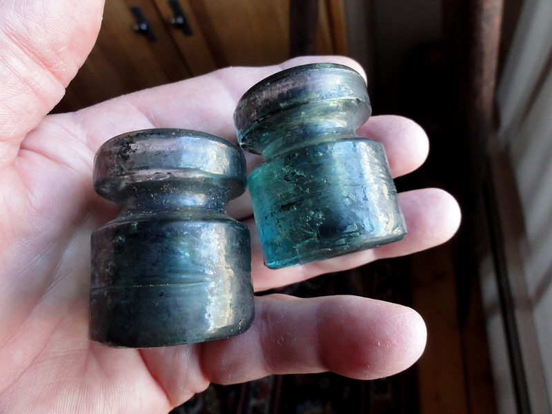 At a local auction today I picked up a box lot of canning jars and a few tobacco tins because down in the bottom there were two glass nob insulators. They are embossed THE E. S. G / & CO., Aqua, and 1 3/4" X 1 1/2 " and although they are known to collectors are still unlisted in the Briel Price Guide. Definitely a fun find. Both have that sooty grim so I think they were used in proximity to steam locomotives. |