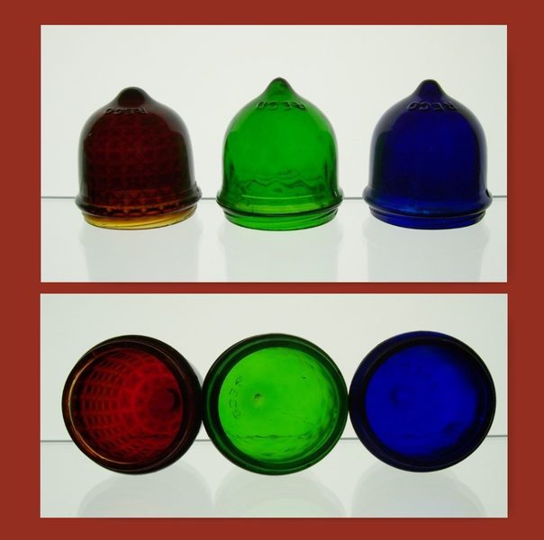 Three older style glass lens airport runway marker lights in Red Amber, 7up Green & Dark Cobalt. RECO is embossed on all three lenses. They are 2 1/2" tall x 2 1/4" wide across the threaded base. The 7up Green one has a very slight inner fracture line in the glass which cannot be felt on the outer or inner side of the glass. Original wire spring style mounting clips will be included. Lenses are brilliantly colorful when back lighted or sat in a sunny window sill. Asking $65 plus shipping for the trio. PayPal (non fee) or personal check. |