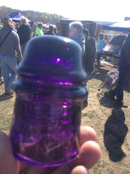 Don't usually snap pictures as I find insulators at flea markets. Had a good reason to do so yesterday at the Stormville NY flea market. There was a new collector from the Cape Cod area that was set up as a vendor selling other stuff. When I first went by his table he only had one common out but said he had a couple more he'd put out when he found them. And of course being a curious hunter I had to return to see if he dug them out. In the mean time I found this purple WGMCo another vendors was selling for $90 according to the sticker price. Just happened that I knew this vendor who sets up at another weekly flea market I attend throughout the season. I put the super near mint pretty insulator down and went on my way only to return and make what I though was a reasonable offer. More then likely if I hadn't purchased this insulator and showed it to the other vendor I would have never known that he was actually a beginner collector. Instead I would have walked away frustrated not finding any insulators yet again at Stormville. To me meeting and talking to that new collector made the visit an extra special one and one I will long remember!! |