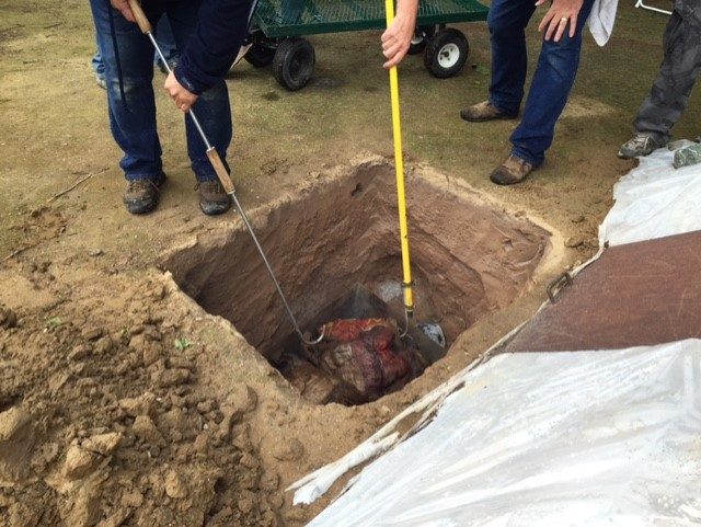 Notice the meat will be cooked below grade-- pit roasting. I think something similar is done in Hawaii when they make their Khalua Pig.