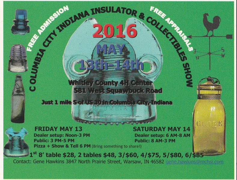 Only a couple of weeks unitil the 2016 Columbia City, Indiana Insulators & Collectibles Show - May 13th and 14th. NO ADMISSION CHARGE! Dealer 8' tables are only $28/1st, $20 each additional & price breaks for more. We are having free pizza & SHOW & TELL on Friday night, so bring an interesting piece to share! Lots of parking, RV's are welcome, (no hookups) Show site address is 581 W Squawbuck road, Columbia City, IN. This is a great show to clean out all the odd collectibles from the garage & sell or trade them. Tables with electricity are limited, so get your reservation $ to Gene Hawkins at the address on the signed contract. Better do it quickly! If you want to see photos of past shows, use the picture poster search function using Columbia City as we've held a collectibles show there the last few years, including a NIA Central Regional. If you have questions, click my address above the flyer and I'll do my best to answer you promptly. Hotels: There are 2 hotels in Columbia City worth noting. The closest is the Quality Inn 260-248-4551. They have an indoor pool, hot tub etc. and is fairly new. The show price is $63/night. The other is the Super 8 260-244-5300 which is older but remodeled at $45 plus tax. YOU MUST TELL THEM YOU ARE SHOW PEOPLE to get the cheaper prices!!!!!! |