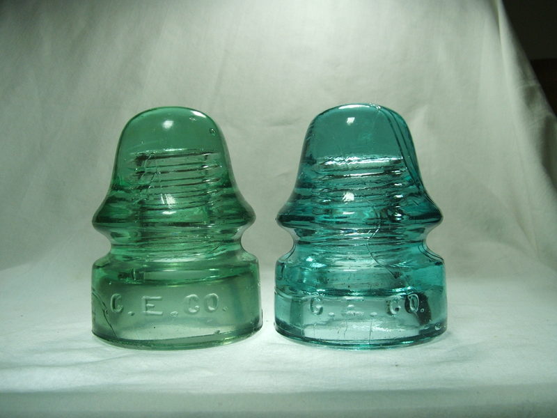 CD 134 G.E.CO. (030) left piece VNM, a couple crown pings and a left front very lower skirt base edge 1/8" shallow flake. There are 7 nice bubbles, and a swirl of milk in the crown. Light green or lime green. CD 134 G.E.CO. (030) right piece VNM one ping and the bottom leg of the "E" is scuffed. There are some nice wrinkles in the front crown along with a light steam trail. I'm asking $12.00 for both plus actual shipping cost. All forms of payment checks, money orders and Pay-Pal (NO FEE) welcomed. |