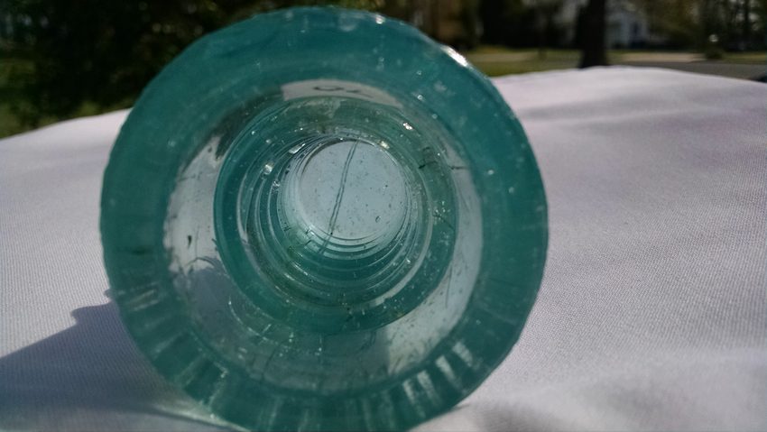 Lt. Milky Aqua, medium size bubble behind insignia, other small bubbles, small specks of white slag, a lot of character! small base chip ( see picture) $85 includes shipping
