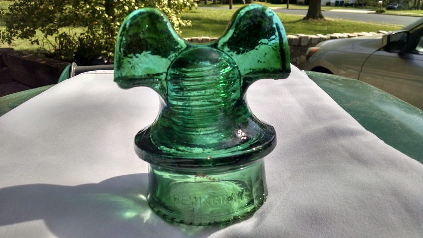 Color Aqua with amber swirls, small bubbles, mint drips, small fingernail sliver missing to right of Hemingray. A beauty! Great Color! $225.00 plus shipping & insurance