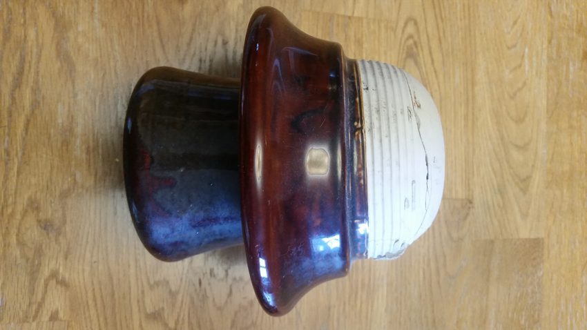 I found this nice middle skirt and bottom last year along with an original pin. I am truly surprised that these survived in good condition. The shells were practically touching with no cement gap. Add the mega freezing weather during the crazy Ontario winters and a little expansion spells hairline crack. |