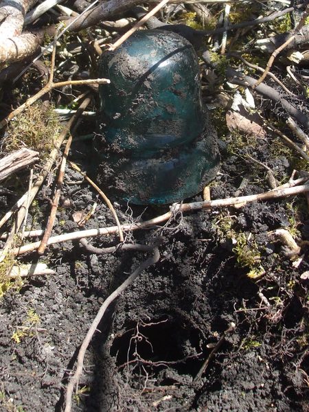 I could see it was likely a 742 by the grooved base, but was it whole? I pulled it out and indeed it was, with a bit of chipping on the skirt and a few pings, but decent condition! That dark line across the dome is a shadow from a dogwood branch above, not busted glass. :) |