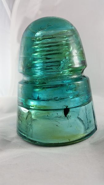 This would have been the nicest piece in the bunch. Light blue Star 145 with a nice piece of something, I think metal, embedded in the skirt with swirls of amber coming from it that go through the whole piece. Unfortunately there is a big chip on the wire groove that caused a crack that circles the dome at an angle. |