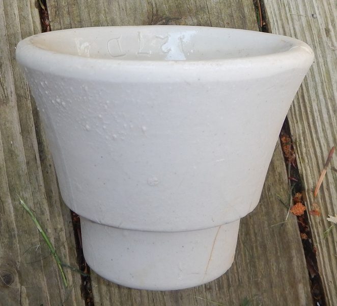 Glaze test sample from the Victor factory ...I picked this up on my last trip along with a few other random not very interesting Fred Locke related things on a brief visit to Victor, N.Y. a few weeks ago . It is the middle skirt to some perhaps unreported glaze-weld they were making . The outer surface is unglazed wile the inside is glazed with a slightly yellowish translucent clear glaze . A number of these have surfaced both in digs at the plant and the old trash dump near Fred's house all with different colours and numbers scratched into them . The number likely reverenced some long ago lost glaze formula reference log book the factory and /or Fred Locke himself used . |