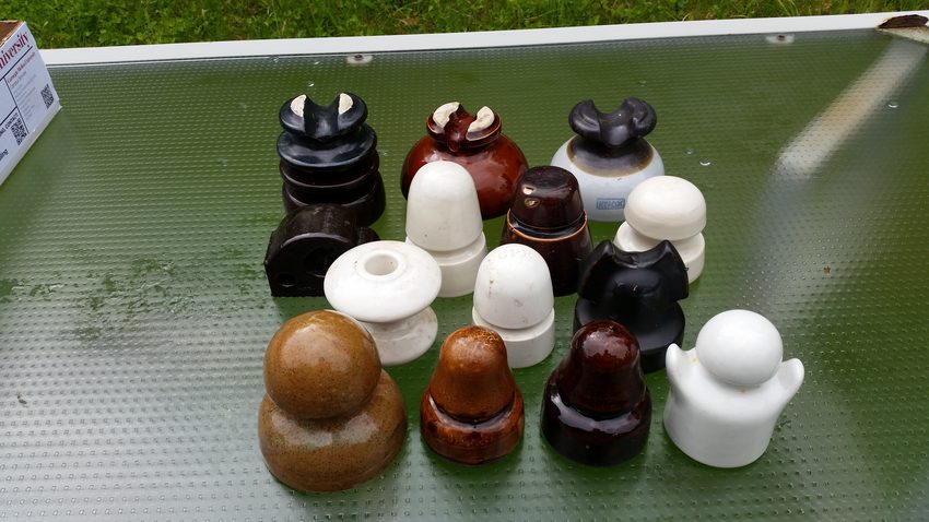 We drove 2 hours north yesterday to attend an auction that had some insulators pictured in the listing. It turns out there were a lot of insulator, but there were also other people bidding on them and I wasn't willing to go into the hundreds of dollars for boxes of wrapped insulators but it turns out I should have. I don't know who the one person was who won one of the boxes, but another Pittsburgh collector got a box that I gave up on at $110 and it had probably $400-$500 worth of insulators in it. And the people there told us that they auctioned off hundreds of insulators on Wednesday that were going for $25 a box. Oh well. Anyway, nice assortment here, what I think is a U-356, definitely dry-process, really pretty tan with sea-foam green overtones, two U-179s (not marked), one a great blonde color, I bought the gingerbread man from the other Pittsburgh collector who doesn't collect foreign pieces, a white spool, a dry process CPR, a Thomas U-388, nice Cutter, U-159 or 160 (not sure), U-172, LAPP U-322, U-798 (I think) with an RFI coating, U-682 (I think) very attractive mottled brown glaze with an "8" stamped on the skirt, no other markings, and a KNOX U-665. |