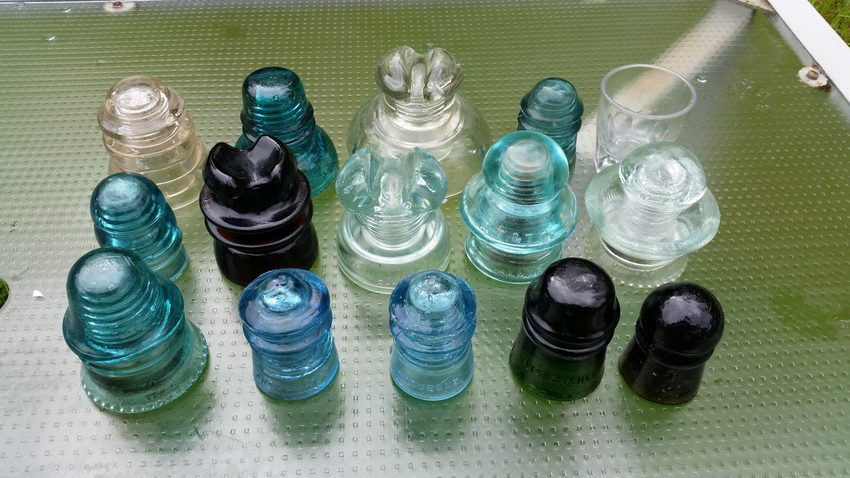 In addition to the porcelain we got at the auction [id=468498930] yesterday, here is some glass. H.G.Co. CD 151, two cornflower blue Duquesne 106.1s [EINs 010 and 020], a green blackglass McLaughlin CD 121, and yellow amber blackglass Diamond CD 102, an OVG CD 112, a rootbeer Armstrong CD 217, smooth base Hemingray CD 252, AT&T CD 190/191, Hemingray CD 202, Dominion CD 155, Hemingray CD 152, Hemingray CD 238, Hemingray CD 113, tumbler that has PRR stamped on the bottom of it (and a big bruise on one side, unfortunately). |