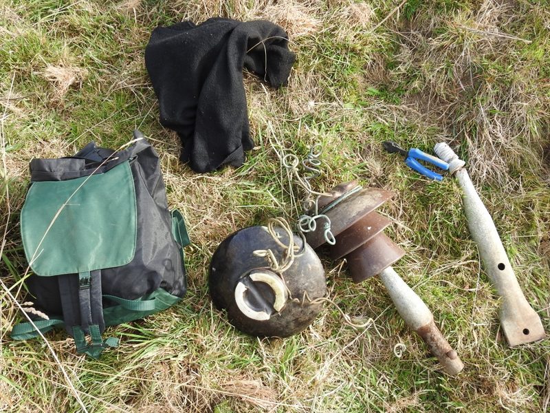 This pic shows the two I got that day. The one next to the Bullers is a Thomas with a partial -20% - stamped mark on it. The metal pins shown here are illustrated in a 1907 talk by the Engineer who set up this Power Scheme, when he addressed the 'The Electrical Association of New South Wales (Australia)'. A later pic will show the exact insulator that the Hydro Electric Scheme used that is also in the booklet of the Engineers address. |