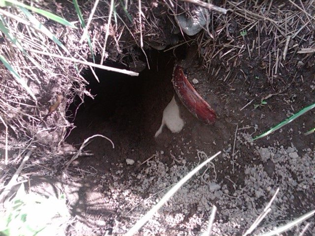 This made me smile, and I felt I just had to share. I noticed that a very fat wood chuck had decided to do some tunneling at the edge of my yard, and when I went to investigate, and perhaps convince him to relocate elsewhere, I noticed something of familiar shape in the wall of his entrance. This just tickled me, thinking of all the time I spend out hunting, never knowing that I apparently have at least one insulator buried unbeknownst to me, right in my yard! Wonder if there are more? In any case, both Mr. Chuck and the insulator can stay for the time being. Happy Hunting, Friends! |