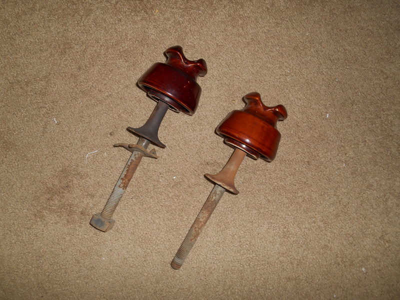 The power company in my area is getting ready to rebuild a long-abandoned 4160V circuit to 13.8kV. One of the poles along the route was cut down and parts of the crossarm were at the pole's base. I managed to spin these two U-484s out of the arm as the nut that held the pin in place on the arm was loose. I should have thought to save the other nut and retaining washer but I lost them in the grass and this was at a fairly visible intersection. A third pin had an obvious step in the shaft about halfway between the bottom of the insulator and the collar but it was still firmly stuck in the arm. |