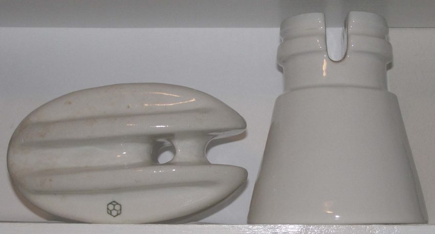 Here are two tough porcelain insulators from Germany as follows -- actual postage additional. Large strain with the German logo for AEG (Allgemeine Elektricitäts-Gesellschaft AG) ink stamped in good condition. $6.00 U-1813 style found in Norway but made in Germany -- Ear top incuse marked SCHOMBURG 1914 in good condition - very cool insulator -- $25.00 |