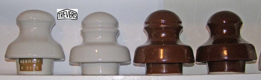 Here are four unusual medium voltage insulators from Germany - actual postage additional: U-2265 dome ink stamp TREVERIS mark -- VNM -- $5 U-2261 Dome ink stamp RIG (Rosenthal Isolatoren GmbH) -- VNM -- $5 U-2261 No markings -- VNM -- $5 U-2263 No markings -- VNM -- $5 Take all four for $15 |