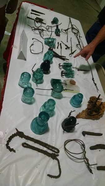 Various pieces found on the over the hill line including big blue, ERW's, CD 127, CD 731, Leffert's hooks, Goodyear hooks with glass additions, tie wires, pole guy wire, handmade climbing hooks made out of iron wire, insulator tie wires, iron nails whole and broken, repair dead ends with jumpers, mule shoe |