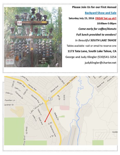 Hi folks, Just a reminder about the 1st annual Backyard Show & Sale at George and Judys home in beautiful Lake Tahoe, CA. on Saturday July 23, 2016 from 9am to 5pm. George & Judy have one of the coolest backyards, with several outdoor insulator pole displays, hobby go-withs, and a little of everything cool that they have picked up on their travels and hikes in the area. And if having all this and a ton of insulators to comb through set against gorgeous mile high ponderosa's isn't enough to lure you in, then surely the free lunch and crystal clear blue waters of Lake Tahoe just a few blocks away surely is. Please plan to get up their way and help make this a great 1st annual show, with many more to come. Hope to see you there, Dan |