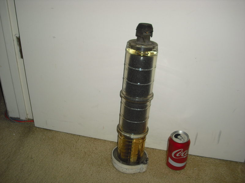 body is glass and the end cap is composite, made by Line Material Company model 4A14. 18 inches long, body is 3.5 in diameter and it weighs almost 10 pounds. there is a scuff mark or two on the glass, otherwise in excellent shape. $35 plus shipping