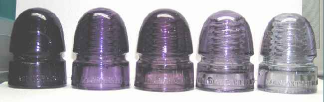 Left to right: CD 143 Canadian Pacific Ry Co dark royal purple, CD 143 Canadian Pacific Ry Co brilliant violet purple, CD 143 Canadian Pacific Ry Co reddish shade of light royal purple, CD 143 Canadian Pacific Ry Co purple swirled medium purple, CD 143 Canadian Pacific Ry Co purple swirled light purple. |