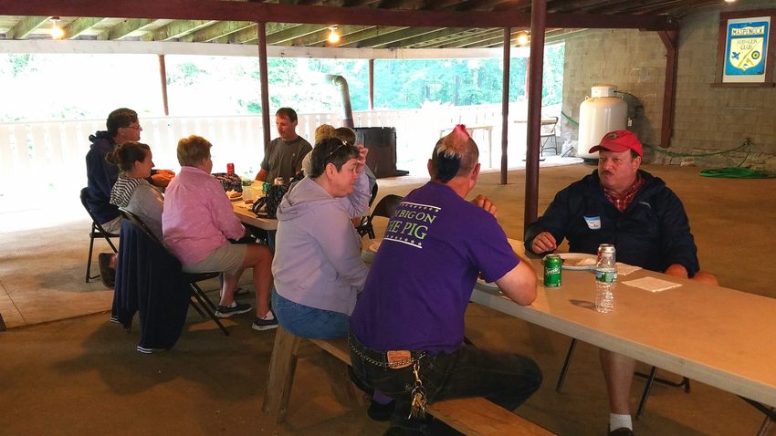 People sitting down having lunch inside. Hot dogs and hamburgers once again expertly prepared by John Rajpolt. Thanks John!
