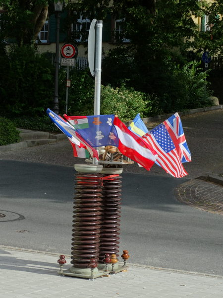 Flags and insulators outside the town hall where the show was held. Over 50 collectors attended the show and brought many interesting insulators for trading. In addition, there were many walk-ins.