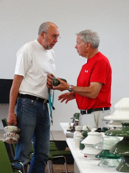 Host Lothar Vormwald and Jim Bergman discuss a special insulator that Jim is holding.