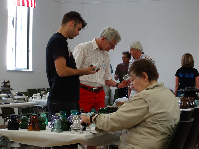 American collectors Curtis and Anne Erickson admiring insulators with Jurgen Lachmann.