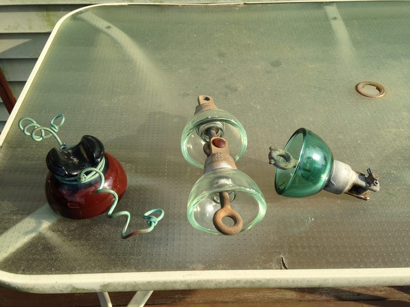 Here are some pieces a buddy of mine saved for me from his work. The pintype is a Knox U-736 with the copper tie wire and the suspensions are all small Sediver bells. The clear ones are from the late 70s and the green one is from 1973. It also has an aluminum cap on it. |