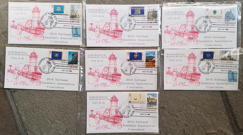 Kevin Lawless continued the tradition of creating first day covers for the National and having them postmarked on site by an official USPS worker. Kevin worked on the design of the post card and Bill Meier created the custom cancel, which is required to be approved by the USPS. They are postmarked N.I.A. STATION / MARLBOROUGH, MA / JULY 14, 1995 These covers are most unique in that rather than all the covers having the same stamps, they have seven variations, each containing a stamp for each New England state. They have Connecticut, New York, Massachusetts, New Hampshire, Vermont, Maine and Rhode Island. The practice of making National show first day covers stopped many years ago. Here is a rare chance to get a bit of insulator philatelic history! Click to zoom in on a stamp. $15 ppd for all 7 as one group. Please supply your USPS shipping address in your first reply. Thanks! |