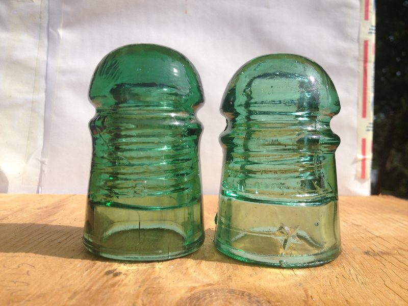 Throwing in the light green pony shown on the right to make up for the inclusion with surface flake on the rear side of dome on the tougher to find green B pony on the left. My iPhone phone camera under exposed the color of both pieces and they are much greener in real life. The Star pony has a hard to notice small bruise on bottom of dome or top of wire groove that you won't see when displaying. I had to tilt insulator in bright light to even know it was there. Have both insulators shipped to your door for $25. Pay Pal non fee is prefered however I will accept a check it you don't have PP account. First email not requiring additional pics takes priority. I do have pic of defects I discribed if need to make your decision. |