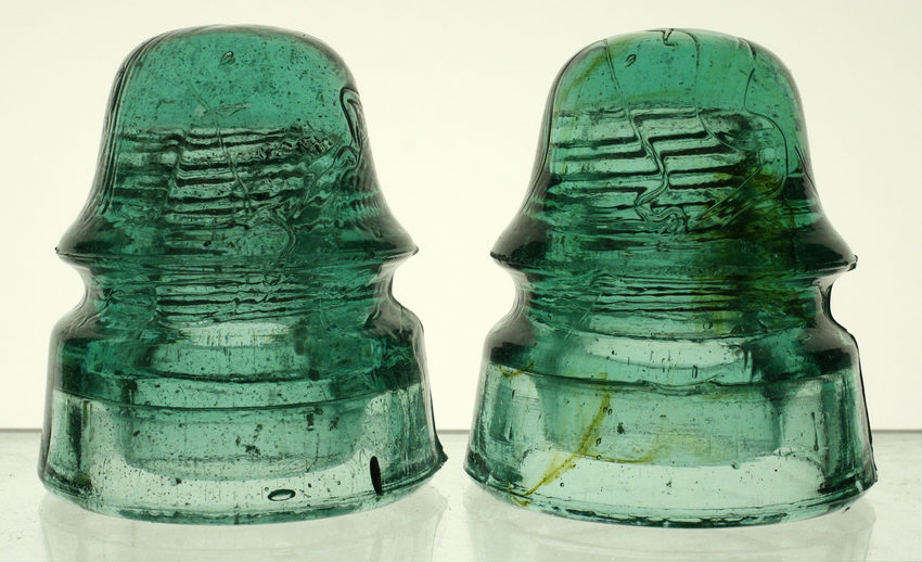 Not many estate sales in Bridgeport, CT advertise 'insulators'. A 4 day sale so I figured lots of them!?! Headed down and a table had a broken CD 122 Hemingray and these two CD 160's. I decided to pick up the pair. The BROOKFIELD NEW YORK typeface embossing is real weak on both. Left one has some neat fizz and stuff in the glass; the right one some neat amber. Both have some surface straw lines. Real sharp edge to the upper wire ridges as well. |