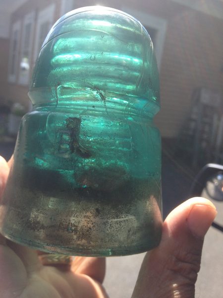 The flea market I usually go to on Sundays was producing any results the last few week so I decided to go to another a little further away in the opposite direction. Often I find no insulators to buy at this other flea market either so this trip was a gamble. At first I was starting to believe my gamble was not going to pay off. In fact that flea market didn't pay off at all. However, right down the road I noticed some guy by an old shed who looked like he was just starting to set up a yard sale. I had a quick debate with myself whether I should take the time and stop. Figured I had nothing in my hands as of yet besides the steering wheel so what did I have to lose? The rest is history know. See my next pic of this beauty all cleaned up by clicking next on the right side of your tool bar at the top of this page. |