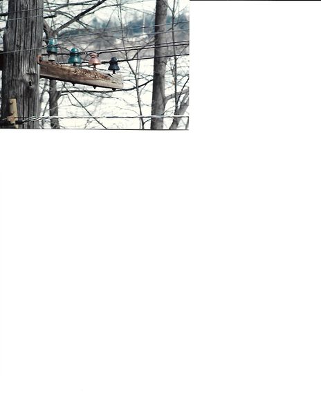 Mix of insulators including a carnival in use on the rail line on the shoreline of Lake Champlain near Crown Point and Ticonderoga, NY. Most of the poles had one or two carnivals.