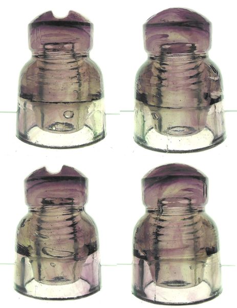 Nice moderately mixed grape and sage green swirls in this insulator. Great condition! I see nothing worse than a few tiny fleabites and a needlepoint pin prick or two. Dome side embossed II.