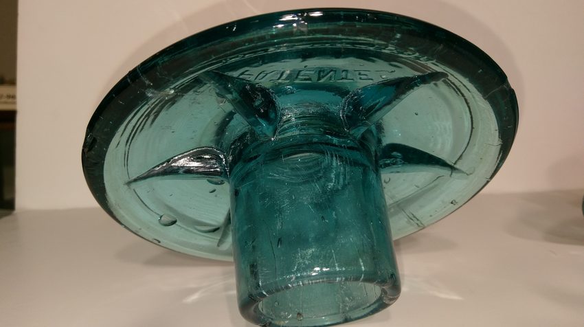 An underside view showing the 6 supporting spokes to strengthen the skirt. Problem is the crown was the weakest part of the insulator. A detailed write-up about this early line and others in Connecticut accompanied my displays at the Washington and Muncie shows. |