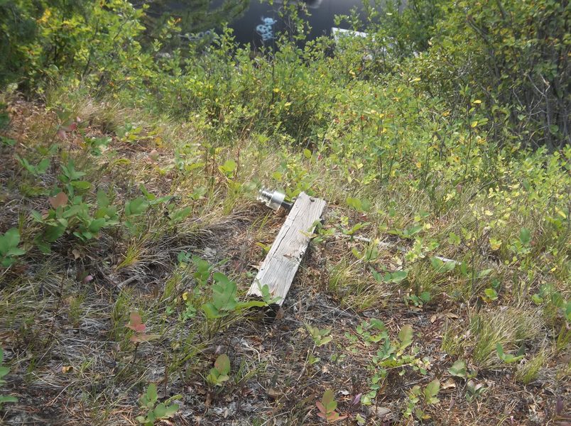 I knew the red, yellow and orange ambers were used in this general area. Are there any to still be found? After a little hiking I came across this 129 and deduced the pole line followed the northern side of the tracks through this remote place. It appeared as if the railroad added a newer crossarm with a communication line (all 129's and tramps) beneath the older arms. |