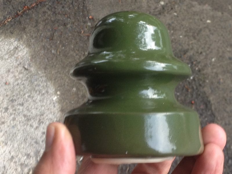 Opps. Something wasn't just right in the glazing department. A couple very tiny spots on the one side of skirt didn't glaze over and there is a bigger blue dot on the lower side of wire groove on same side. The dome doesn't look like the insulator was dusted off either before glaze was applied. Texture is rough from glaze over the dust. There are also two indentations on the bottom of skirt that were glazed over. Din't know what caused them. Maybe tooling. Color wise my pic didn't capture true color. I sold a simular 309 in same color. The buyer called an olive green color when he had it. Anyway, I sold another green 309 like this about a month ago for $21.80 shipped. Will let this one go at the same price. Pay Pal non-fee prefered. If you don't have an account I also except personal checks. First email gets this tougher to find colored porcelian insulator. |