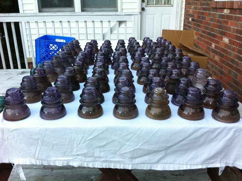 About a year ago I was spending the day with my family and good friend Jeffrey Kraemer. My sister was on Facebook and saw where a friend of hers posted some pictures of a bunch of insulators her husband had just brought home to her. My sister showed the pictures to Jeffrey and me and some looked like they were purple. I contacted the lady to see how many purple insulators she had and if she would sell some. She said they were piled up in some tubs and a trunk and there was at least 16 purples in the lot. I made arrangements to drive about an hour and a half to meet up with her and her husband at a gas station. I could hardly believe it when they pulled up with the piles of insulators in the back of their truck and about half of them looked like they were purple CD 154 Whithall Tatums. The husband said the insulators were from his bosses dads place. They found them and other railroad related stuff stored in an old grain silo. The guy had worked for the Central of Ga. RR for over 40 years and brought all this stuff home from work. I made a deal on the insulators and also a couple of old street lights they had and came home. At home I enjoyed sorting thru all the insulators. I was hoping to find some Boston's or other early telegraph insulators that were known to have been found along the Cen of GA. There was no Boston's but I did get a few CD 151 CREB's including one with a nice carbon bubble in the skirt, 2 pink CD 154 Whithall Tatums and a total of 71 purple CD 154 Whithall Tatums! Since then I have sold all the nice purples and just kept a few of the damaged ones for outside pole displays. |